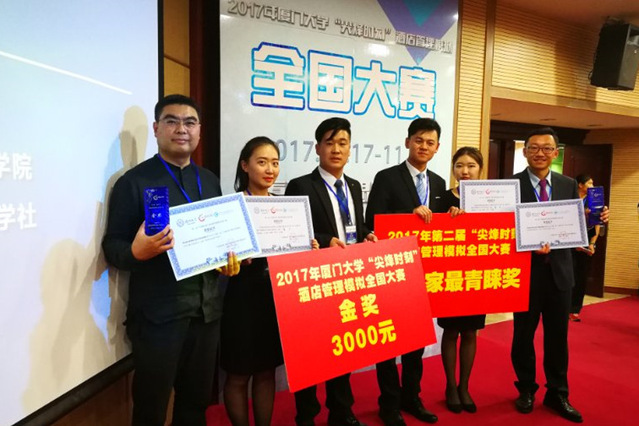 本网讯 (旅游与酒店管理学院 张峰) 11月17日至19日,“尖烽时刻”第二届酒店管理模拟全国大赛决赛在厦门大学举办,我院由酒店管理专业学生李伟、李敬铁、马乙鑫与王艺颖组成的“东方精选”代表队荣获金奖与企业家最青睐奖,专业教师张峰、张朋荣获优秀指导教师荣誉称号。
