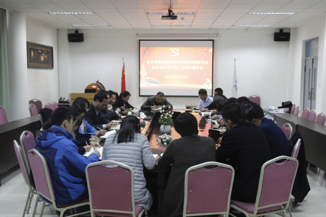 本网讯 (行政二支部) 为深入学习宣传贯彻党的十九大精神,勉励广大党员不忘初心、牢记使命,11月24日,机关党总支行政二支部召开主题党会,开展十九大精神学习教育活动。学院党委副书记、院长姜玉鹏以《增强使命感,建设优质校——十九大精神学习体会》为题,为支部全体党员作了一堂专题辅导讲座,党委委员、副院长王建宝出席,会议由行政二支部书记王健主持,支部全体党员参加了学习。