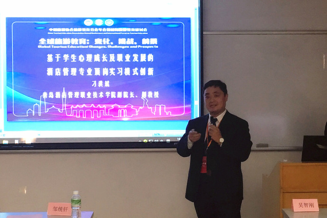 本网讯 (旅游与酒店管理学院 石媚山) 11月30日到12月1日,由中国旅游协会旅游教育分会主办、中山大学旅游学院承办的中国旅游协会旅游教育分会第三届会员代表大会暨国际旅游教育研讨会在广州中山大学顺利举行。我院院长姜玉鹏、副院长刁洪斌、旅游与酒店管理学院副院长石媚山应邀参会。会上,姜玉鹏当选为中国旅游协会旅游教育分会第三届理事会副会长;刁洪斌向与会专家学者作了题为《基于学生心理成长及职业发展的酒店管理专业顶岗实习模式创新》的主题演讲。