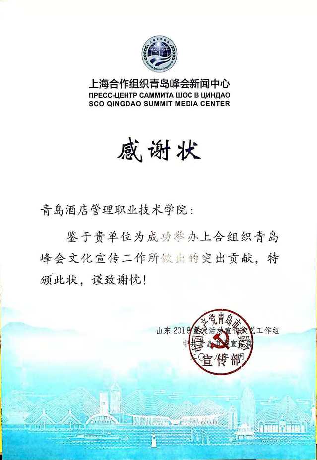 上合组织青岛峰会新闻中心给学院发来感谢状