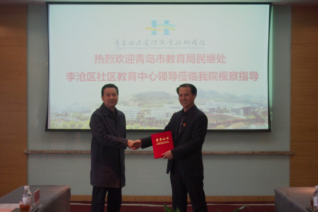 本讯网(继续教育学院 廖金城)4月4日,青岛市教育局民办与继续教育处处长李运忠、青岛广播电视大学社区教育学院副院长邵艺、李沧区社会教育办公室主任王波等一行4人来到我院参观交流。学院副院长王建宝、继续教育学院院长曲洋、信息工程技术学院党总支书记赵德银在旅游与酒店实训中心一楼多功能厅热情接待了来访客人。