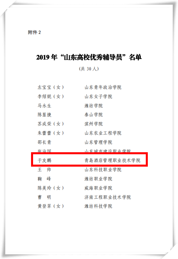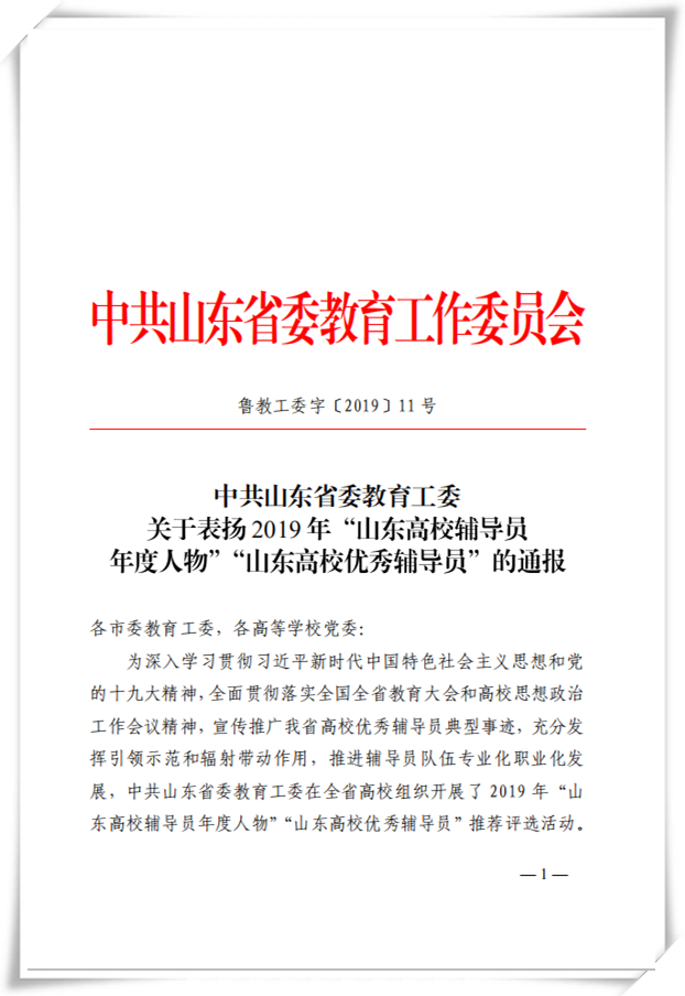 本网讯(学生工作处 童菲)近日,中共山东省委教育工委下发《关于表彰2019年“山东高校优秀辅导员”的通报》,对山东省高校杰出辅导员进行了通报表彰,我院艺术学院辅导员于友鹏老师喜获2019年“山东高校优秀辅导员”荣誉称号。