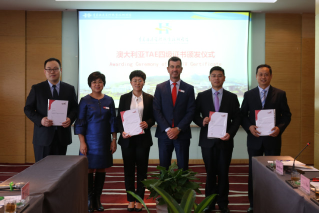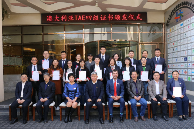 布莱特对学院的热情接待表示感谢,他介绍,TAE培训及评估四级证书在澳大利亚职业教育和培训领域中,是培训师和评估师必备的资格证书,具有较强的国际影响力,并以考核严格著称。此次我院教师所获得的澳大利亚TAE40116四级证书是澳大利亚最新培训课程包,我院成为国内第一家高标准、高质量完成澳大利亚TAE40116版本四级职业资格证书学习的高职院校。布莱特对学员们取得的学习成果表示充分肯定,并现场为参培教师颁发了澳大利亚TAE40116四级证书。