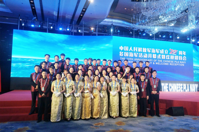 本网讯(旅游与酒店管理学院 李云鹏)日前,中国人民解放军海军成立70周年多国海军活动开幕式暨欢迎招待会和“构建海洋命运共同体”海军活动高层研讨会在青岛香格里拉大酒店举行,我院酒店管理专业50名学生经过一系列高规格、高标准的培训后,以专业的服务技能、优秀的职业素养和出色的外语水平圆满完成会议服务工作。