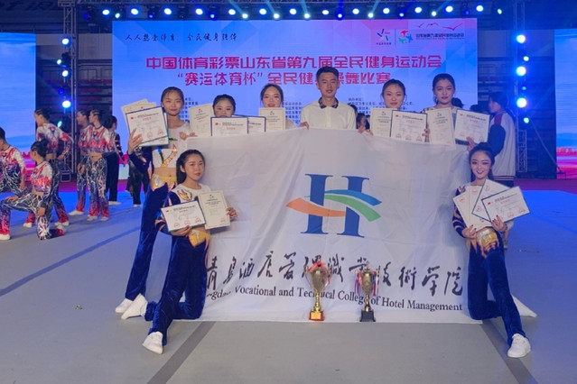 本网讯(旅游与酒店管理学院 刘云飞)日前,2019年山东省第九届全民健身运动会全民健身操舞比赛在青岛市城阳区体育馆举行,学院健美操协会在指导教师徐昂的带领下组队参赛,在高职组比赛中勇夺两枚金牌,荣获特等奖。