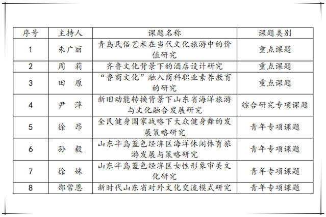 本网讯(科研发展处 王萍)近日,山东省艺术科学重点课题评审办公室公布了2019年度山东省艺术科学重点课题立项评审结果,我院8项课题获准立项,其中,重点课题3项,综合研究专项课题1项,青年专项课题4项。具体立项课题如下: