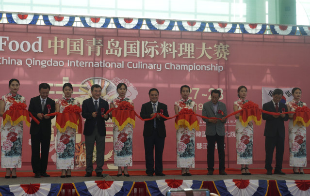 在热烈的掌声中,与会领导为“2019 K-food中国青岛国际料理大赛”剪彩。
