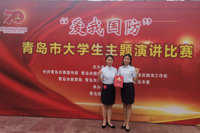 本网讯(学生工作处 王巍娟)9月11日,“爱我国防”青岛市大学生主题演讲比赛决赛在青岛理工大学举办,旅游与酒店管理学院2018级旅游管理1班卢郁、工商管理学院2018级会计6班齐艺妍代表我院参赛,并荣获二等奖。