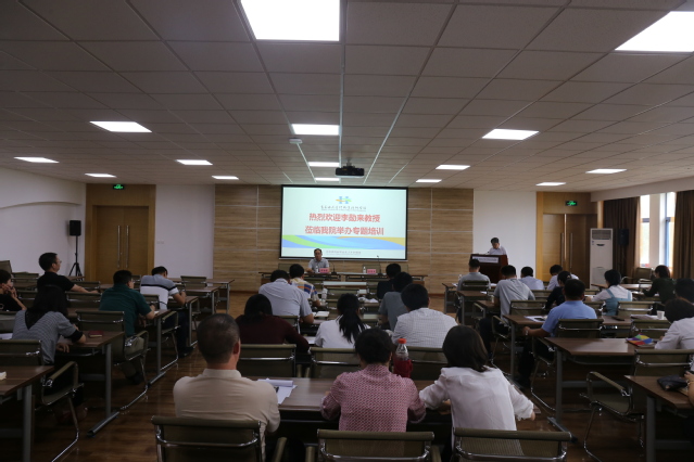 本网讯(科研发展处 王萍)9月19日下午,科研发展处邀请青岛科技大学博士生导师、人文社科处处长李勋来教授来校举办项目申报培训会。各二级院部、相关职能处室负责人,学院学术带头人和博士教师,各申报课题负责人及课题组成员共近60人参加了培训会。培训由学院副院长宫恩龙主持。