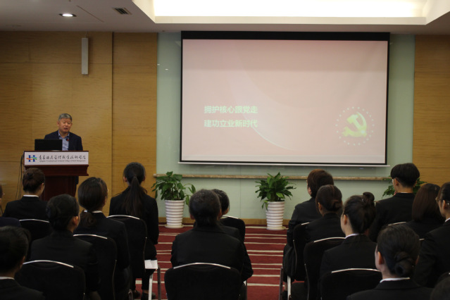 10月22日,学院党委书记李达走进2019级酒店管理8班,参与“我与祖国共担当”爱国主义教育主题班会,并为同学们带来“做到‘两个维护’,坚定永远跟党走的理想信念”的思想政治课。李达围绕什么是“两个维护”,为什么要做到“两个维护”,做到“两个维护”引领中国发展行稳致远三个方面,为同学们上了一场生动的思想政治课,进一步深化了同学们的爱国感悟。