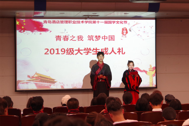 基础部礼仪教授、青岛市礼仪学会发起人杨萍做了中国传统成人礼讲解。随后,在司仪于友鹏的主持下,男子“冠礼”、女子“笄礼”正式开始,来自各二级学院的十名男同学和十名女同学身着汉服依次上台,十余位社会贤达为其进行三次“加冠”及“加笄”。男子第一次加冠表示缅怀先祖,不忘祖德;第二次加冠代表冠者可以报效社会,保家卫国;第三次加冠代表从此可以参与重要的祭祀活动。女子第一次加笄象征着豆蔻少女的纯真;第二次加笄,象征着花季少女的明丽;第三次加笄则反映了我国古代女性雍容大气,典雅端丽的审美取向。