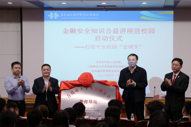 本网讯(信息工程技术学院 李珊荃)11月14日下午,青岛市金融安全知识公益讲座进校园启动仪式暨“青岛市大学生金融安全教育基地”授牌仪式在学术报告厅举行。青岛市教育局高教处调研员王涵、青岛市中级人民法院金融庭庭长程超、上海财经大学财富管理研究院执行院长姜晖、学院副院长刁洪斌等出席活动,并为“青岛市大学生金融安全教育基地”揭牌。本次活动由信息工程技术学院与青岛市教育局、青岛市中级人民法院、上海财经大学青岛财富管理研究院等联合举办。
