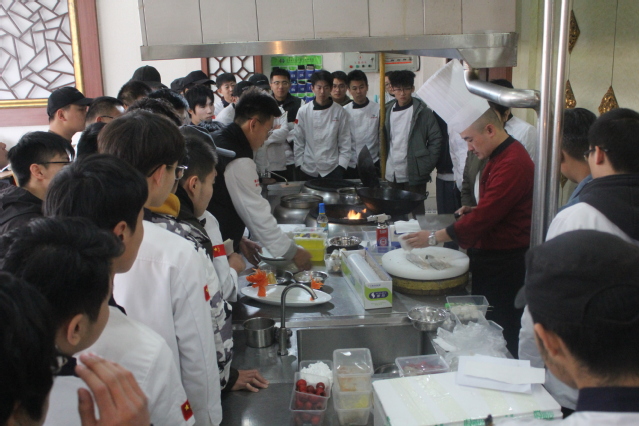 各单位的行政总厨、厨师长分别进行烹调工艺与营养、西餐工艺、中西面点工艺等专业的技能演示及交流。合作酒店对此次校企技能交流活动非常重视,为了取得更好地交流效果,各单位都做了充分准备,力求完美呈现专业技能。大师们向同学们进行菜品展示的同时,还向同学们介绍了自己的成长经历及当前餐饮业发展的趋势、酒店厨房的管理模式、厨师长职责、员工职责等,让同学们对酒店厨房工作模式及环境设施有了大致了解,为将来外出实习做好了充分的心理准备。