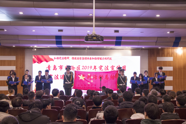 本网讯(信息工程技术学院 孙梦男)12月7日,青岛市李沧区2019年宪法宣传周“宪法知识进网络”系列活动总结大会在学术报告厅举行,本次活动由青岛市司法局、中共李沧区委宣传部、李沧区司法局和学院共同举办,青岛市司法局普法和信息宣传处处长潘月民,李沧区司法局党委书记孙兰泉,青岛市司法局普法和信息宣传处副处长姜海明,学院副院长刁洪斌等出席活动,400余名师生代表参加本次总结大会。