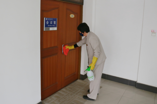 学院总务处购置防疫物资,对校园进行全方位消毒,对学院公共区域、设备按照“一日一消毒”制度喷洒消毒液,对值班场所等有人员区域增加消毒频次,对门把手、水龙头、电梯按钮、楼体扶手等细节进行擦拭消毒,确保消毒做到“无死角”“全覆盖”,减少细菌、病毒的存活和繁殖。