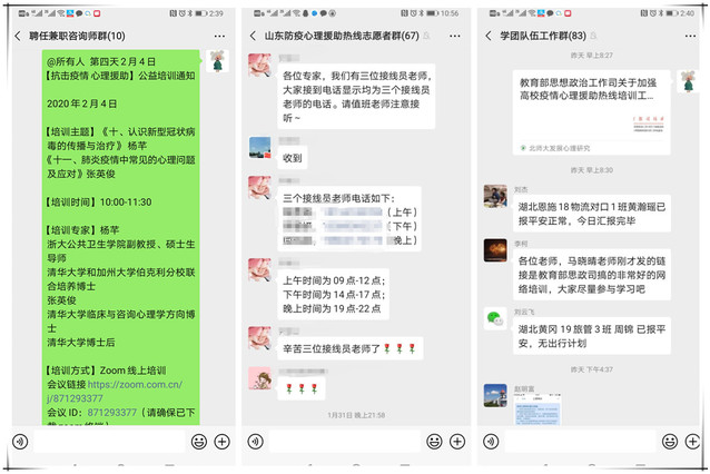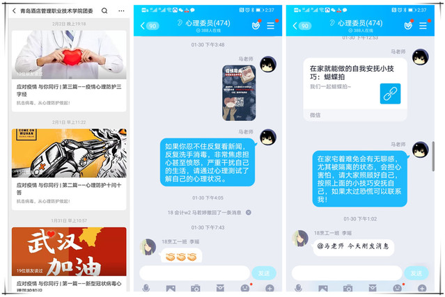 应对疫情期间,学院学团工作人员每天要及时统计汇总信息,直接与学生沟通,做好心理援助工作的“防护墙”。团委倡导停“工”不停“学”,累计为相关老师提供心理援助和心理应激系列专题网络培训资源31场次,培训内容既可以满足现阶段心理援助需求,也可以为春季开学后的心理健康工作提前做好准备。同时学院发挥省级大学生心理健康示范中心的带动作用,组织专兼职心理咨询师积极服务社会,参加山东心理学会抗疫心理援助热线、青岛市心理学会“阳光心旅”心理援助热线等各级各类心理援助工作,在实战中提升危机应对的工作能力,同心共筑心理“防护墙”。