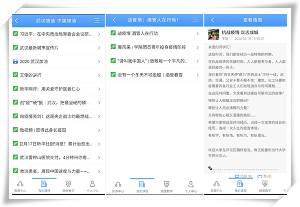授课教师认真落实课程思政要求,纷纷以全民众志成城、共克时艰的抗疫精神为教材,以生命守卫生命、最美逆行者的感人事迹为案例,号召同学们尊重自然、敬畏生命,身在隔离、心向世界,致敬英雄、牢记担当。同学们学习踊跃、积极配合,希望早日回到美丽的校园、回到安静的教室。