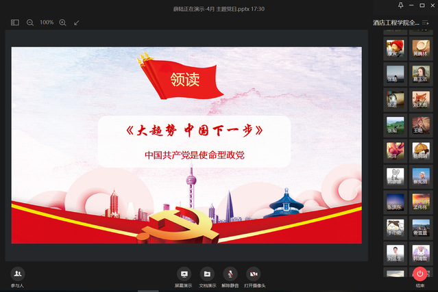 本网讯(酒店工程学院 赵婧)4月23日,根据学院关于广泛开展“新时代新使命新愿景”读书竞赛活动的要求,酒店工程学院党总支开展 “领读新使命,匠心铸师魂”线上主题党日活动,酒店工程学院全体党员参加会议。