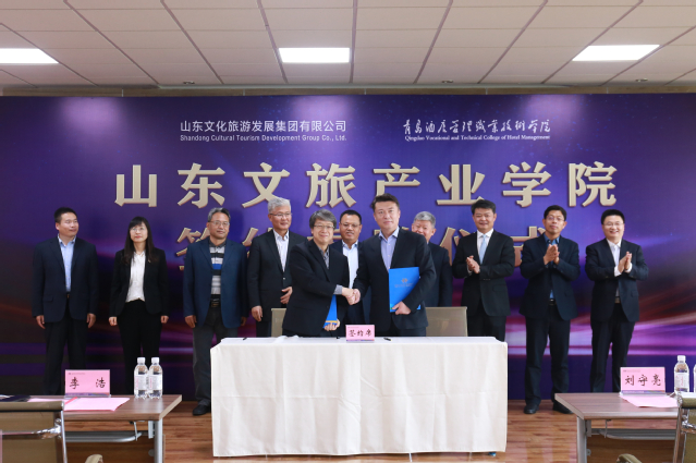 李浩在致辞中介绍了山东文旅集团的基本情况,是全省唯一入选中国旅游集团20强的企业。他指出,此次签约标志着双方的合作迈上了新高度,希望双方按照“友好诚信、资源共享、优势互补、互惠互利、共同发展”的原则,积极在合作办学、员工培训与继续教育、课程共建、产学合作等方面展开更加广泛深入合作,为全省文旅行业培养更多高素质技术技能型人才。