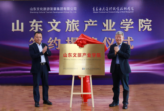 鲁商集团党委副书记、山东文化旅游发展集团有限公司总经理刘守亮和学院党委书记李达共同为“山东文旅产业学院”和“产教融合实训实习基地”揭牌,山东文化旅游发展集团有限公司副总经理、银座旅游集团董事长李浩和学院副院长宫恩龙代表双方签署了山东文旅产业学院校企合作协议书。