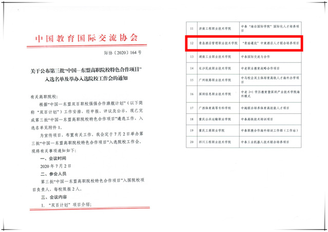 “中国-东盟高职院校特色合作项目”由教育部国际合作与交流司指导,中国教育国际交流协会具体开展,周期五年,每年遴选20个与东盟成员国的特色合作项目作为示范引领。此次成功入选,是学院教育国际化进程中继“亚太职业教育影响力50强”“国际影响力50强”“世界职业院校与技术大学联盟卓越奖”之后的又一里程碑事件。