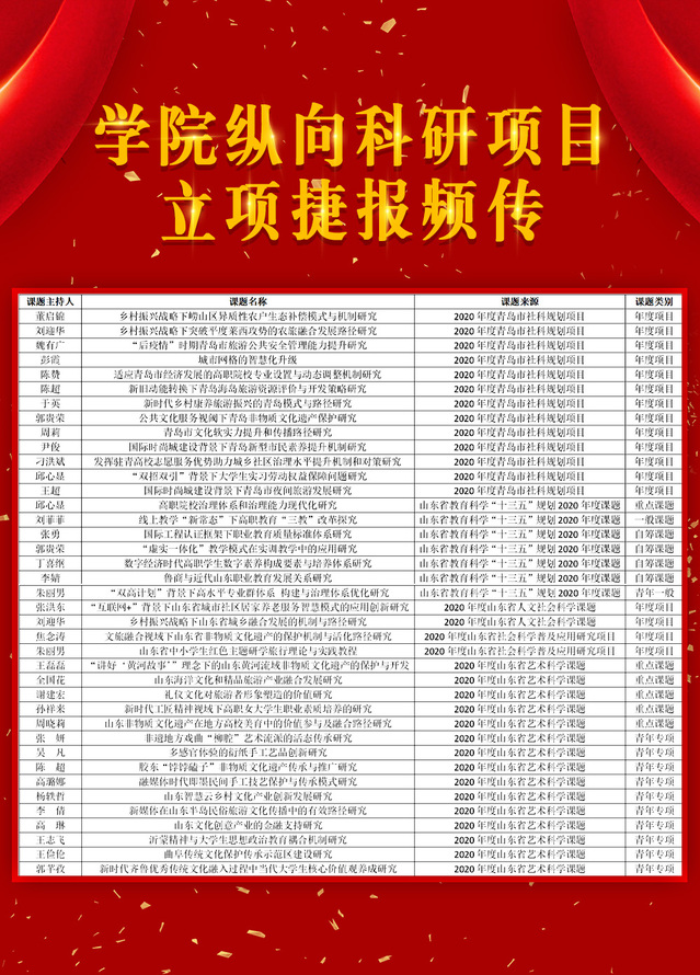 本网讯(科研发展处 王萍)暑假期间,我院纵向课题立项捷报频传,近期共获得课题立项62项。其中,获得青岛市社科规划项目13项,山东省教育科学“十三五”规划2020年度课题7项,山东省社科联人文社会科学课题2项,山东省社科联社会科学普及应用研究项目2项,山东省艺术科学重点课题15项。另外,我院还获得山东省旅游职业教育专业建设指导委员会2020年度规划课题立项20项、山东软科学研究会“产教融合研究智库专项”2020年度课题3项。