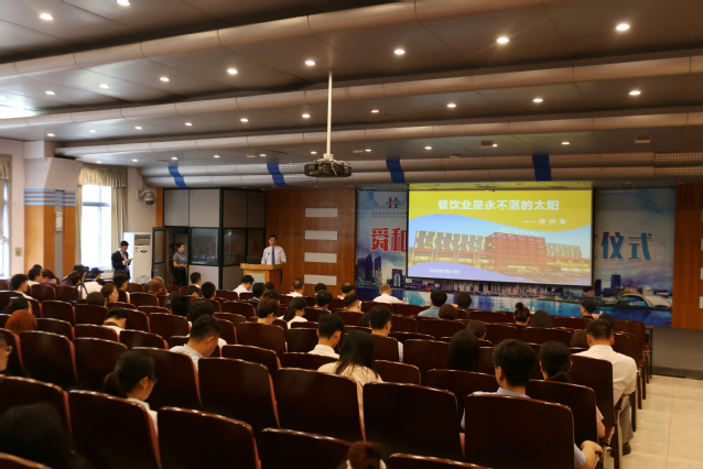 仪式后,任兴本以《餐饮业是永不落的太阳》为题讲授产业学院第一课,他介绍了舜和酒店集团的发展历程及企业标准化管理体系,分析了当前餐饮行业的发展现状及趋势,鼓励同学们努力学好专业知识,为餐饮行业的发展做出贡献。