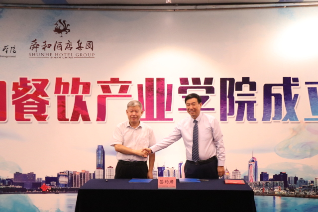 本网讯(烹饪学院 李军)9月17日,学院与山东舜和酒店集团签约成立舜和餐饮产业学院,揭牌仪式在学术报告厅举行。