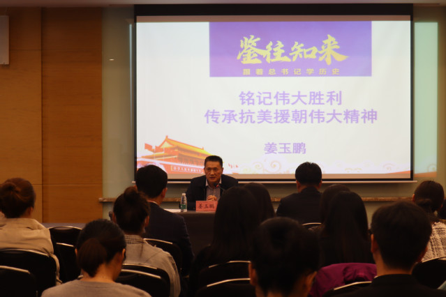 姜玉鹏带领全体党员重温历史,共同回顾了抗美援朝战争的伟大胜利和巨大贡献,深刻阐述了抗美援朝精神的历史意义和时代价值。他要求,全体党员干部要深入学习贯彻习近平总书记在纪念中国人民志愿军抗美援朝出国作战70周年大会上的讲话精神,传承和发扬“祖国和人民利益高于一切、为了祖国和民族的尊严而奋不顾身的爱国主义精神,英勇顽强、舍生忘死的革命英雄主义精神,不畏艰难困苦、始终保持高昂士气的革命乐观主义精神,为完成祖国和人民赋予的使命、慷慨奉献自己一切的革命忠诚精神,为了人类和平与正义事业而奋斗的国际主义精神”。他希望,全体党员干部要积极干事创业、勇于攻坚克难,为学院的发展建设不断积蓄力量。