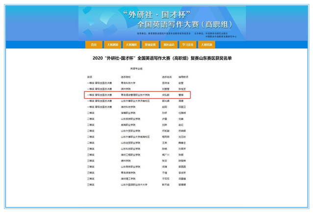 本网讯 (工商管理学院 徐豪杰) 近日,2020年“外研社·国才杯”全国英语写作大赛(高职组)复赛山东赛区成绩揭晓,学院工商管理学院商务英语专业学生宋弘毅荣获大赛一等奖,并将代表山东省参加全国总决赛。