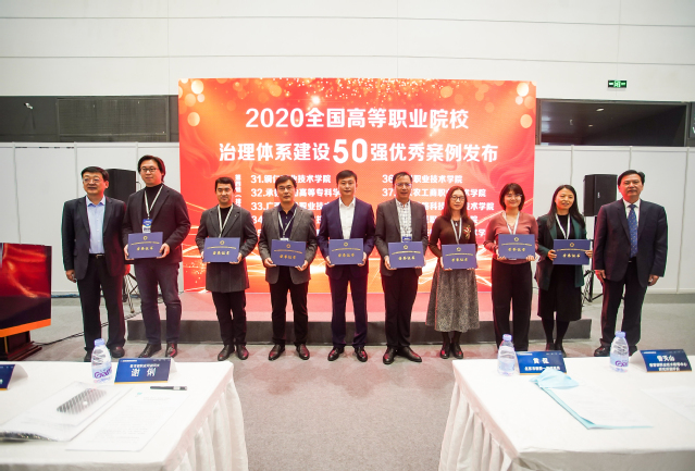 副院长于宏刚(中左)代表学院领取全国高职院校治理体系建设50强优秀案例证书