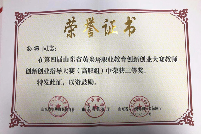 本网讯 (会计学院 丁飞) 近日,第四届山东省黄炎培职业教育创新创业大赛获奖名单公布,学院教师孙丽荣获教师创新创业指导大赛(高职组)三等奖。