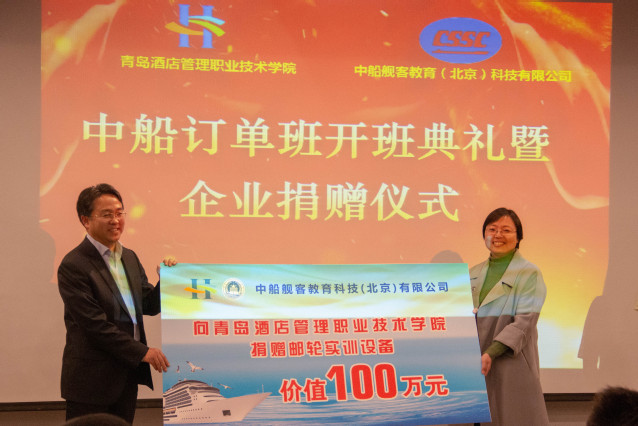 开幕式上,酒店管理学院院长王昌玉和山东国信国际经济技术合作有限公司董事长孙国庆代表校企双方现场签约,双方合作成立“国际邮轮乘务管理(校企合作班)”。中船舰客教育科技(北京)有限公司山东区总经理相爱美向学院捐赠价值100万的邮轮实训设备,双方将合作成立“中船订单班”,合作共建“全国邮轮人才职业培训基地”,共同开启校企深度融合协同育人新征程。