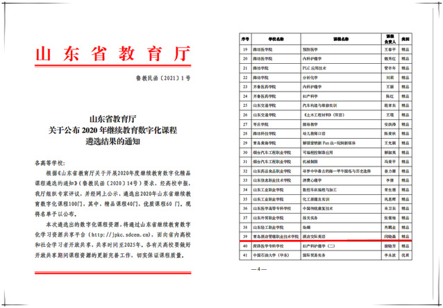 本网讯(继续教育学院 廖金城)1月10日,山东省教育厅下发《关于公布2020年继续教育数字化课程遴选结果的通知》(鲁教民函﹝2021﹞1号),学院闫晓磊老师的《酒店交际英语》被评为精品课程,崔婧老师的《纳税申报实务》和刘进涛老师的《会计基础》被评为优质课程。