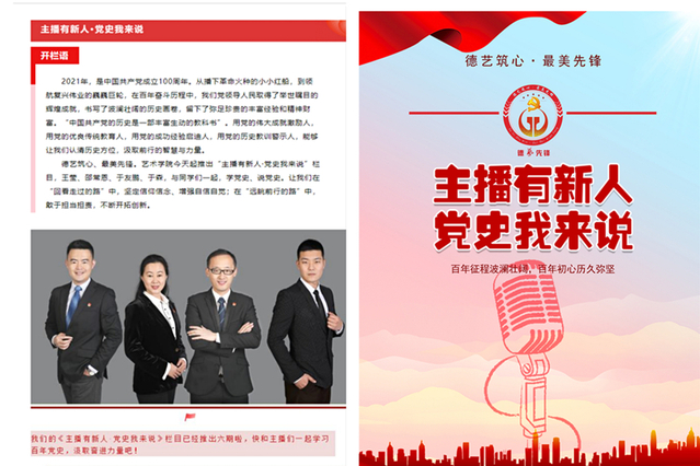 运用信息化技术,创新党史学习教育形式。艺术学院党总支将互联网与党史学习教育相结合,在艺术学院微信平台上开设“主播有新人•党史我来说”广播栏目,由党团老师亲自领读,每周定时推送。目前,该栏目已推出6期,受到师生一致好评。此外,艺术学院党总支还将推出VR党建,以更受青年学生欢迎的沉浸式、互动性的体验学习形式开展党史学习教育,让师生党员足不出户就能感受历史,了解党的发展历程。