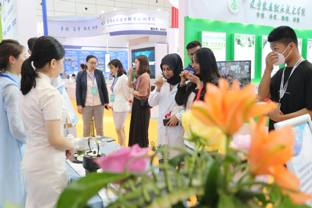 学院展区以多媒体影音、实物、平面图文及职业体验观摩互动等形式相结合,设置“百年芳华·帆之都”主题展台、“双高计划”建设成果展及食品雕刻、中华茶艺、咖啡艺术、插花艺术、调酒艺术、衍纸艺术等互动体验项目展台。展台设计凸显学院“聚焦酒店业办专业”和酒店产业链条专业组群发展的理念,融合酒店管理、环境艺术设计、烹调工艺与营养、工艺美术品设计等专业特色。