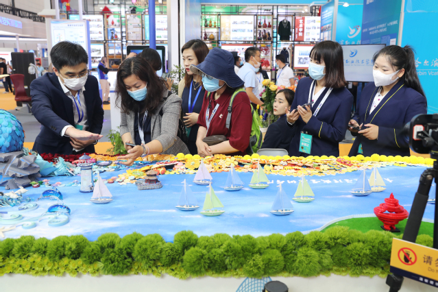 “百年芳华·帆之都”主题展台,围绕庆祝中国共产党成立100周年,集面塑、衍纸、插花、景观设计、饽饽榼子等技艺技能为一体,由学院文创产品饽饽榼子塑造的“游鱼”形象象征莘莘学子力争上游的精神、“大树”形象象征学院“十年树木,百年树人”的教育责任;衍纸花、面花和艺术摆花的融合寓意学院“专业融合、百花齐放”,“孔雀”造型寓意学院德育为先、知行合一的教育理念,“浪花”与“帆船”彰显了学院乘风破浪、勇往直前的奋斗精神。展台运用3D全息投影视频和3D打印雕塑,凸显学院专业特色,增强展台的科技时尚感。