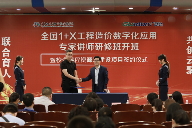 张宗国代表学院与广联达科技股份有限公司产品总监胡振博共同签署校企课程资源库建设项目协议。