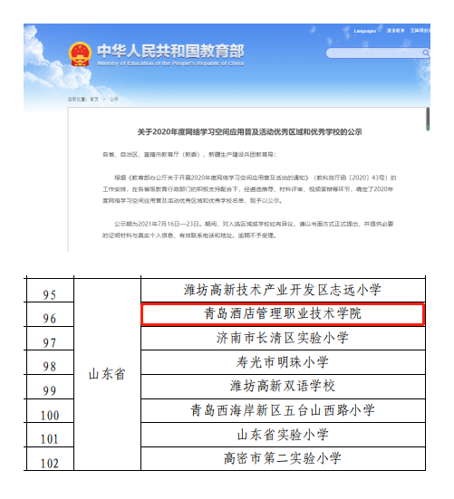 本网讯(教育信息中心 郑成栋)近日,教育部发布《关于2020年度网络学习空间应用普及活动优秀区域和优秀学校的公示》(教科信厅函〔2021〕24号),学院作为全省唯一一所入选高校,荣获“2020年度网络学习空间应用普及活动优秀学校”称号。