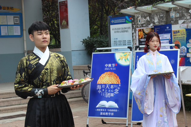 同学们将中秋节相关诗词制作成展板,供过往的师生驻足赏析,并身着传统汉服,用新时代的精神风貌展示着中华传统服装的韵律与大美。同时,准备了各式各样的月饼,让老师和异乡求学的学子们感受到了学院浓浓的关怀,体验中华传统美食的魅力。