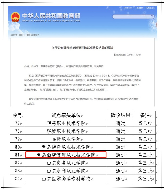 本网讯(教务处 孙康)近日,教育部下发《关于公布现代学徒制第三批试点验收结果的通知》(教职成司函〔2021〕40号),公布现代学徒制试点单位验收检查结果,学院现代学徒制试点项目顺利通过教育部验收。