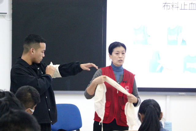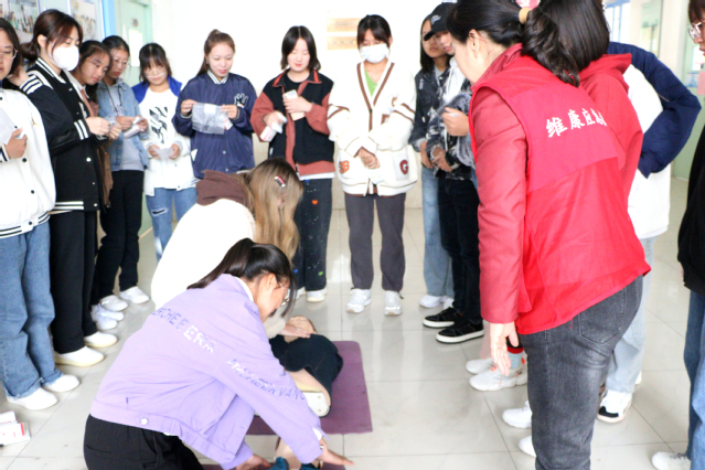 本网讯(酒店管理学院 高晴)为将安全教育和心理健康教育落到实处,让应急救护知识进校园、进课堂,筑牢校园安全防护线,10月21日,酒店管理学院联合李沧区九水路街道办事处、青岛维康应急救护教育机构开展“第一响应人”应急救护培训。