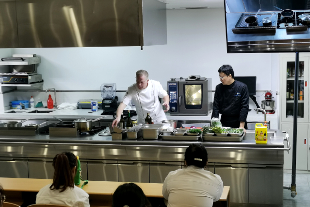 活动期间,青岛海天大酒店行政副总厨DIVIKI Szabolcs、青岛涵碧楼酒店行政总厨李朝斌、青岛香格里拉大酒店行政饼房厨师长梁志超分别为烹调工艺与营养、西餐工艺、中西面点工艺等专业学生进行了技能演示及交流。大师们结合菜品的制作,从刀工、油温、烘焙、装盘、色泽搭配等细节进行了精心讲解,并围绕各自的成长经历、餐饮业发展趋势以及酒店厨房管理模式等问题,为学生成长成才、实习就业解答困惑、提供指导。
