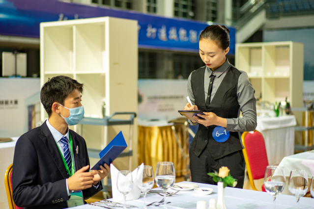 与往年相比,中餐“主题宴会设计”模块更具创意设计感,也更贴近时代主题;西餐“休闲餐厅服务”全程使用英文沟通服务,展现了选手更加全面的综合素质。此外,为了保证比赛的公平性和准确性,此次比赛采用了定制化的抽签及计分系统。同时,全力做好赛事疫情防控工作,实行赛前健康承诺、赛中测量体温、赛后疏导流动,从酒店到比赛地点实行闭环管理,并在校内及酒店设置了5个观摩区,参赛队可以在酒店通过直播观摩比赛。