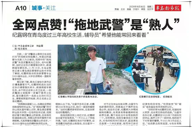 本网讯(党委宣传统战部)11月14日,《人民日报》官微点赞学院校友、“拖地武警”纪露钢在全国范围引起强烈反响。连日来,《青岛日报》、腾讯网、大众网、齐鲁壹点、信网、鲁商集团官微头条等多家媒体进行了持续报道;《青岛早报》《半岛都市报》以整版篇幅对热搜背后,纪露钢在校期间的历练与成长进行了深度报道,学院校友纪露钢的行为获得了全网点赞。
