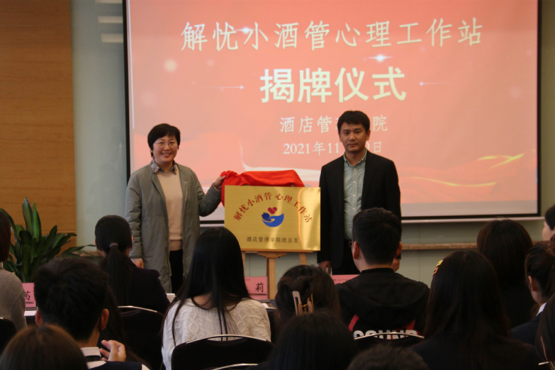 本网讯(酒店管理学院 高璐娜)“让世界充满幸福的微笑”。11月19日,酒店管理学院举行“解忧小酒管”心理工作站揭牌仪式。