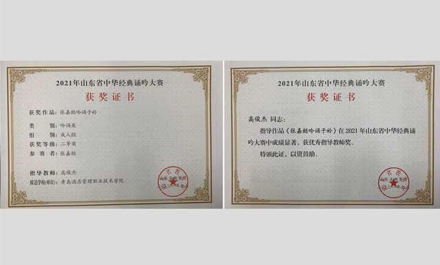 本网讯(基础教学部 高俊杰)日前,在2021年山东省中华经典诵吟大赛中,学院2019级旅游管理学院学生张嘉懿的吟诵作品《子衿》喜获二等奖,基础教学部高俊杰老师获得优秀指导教师奖。