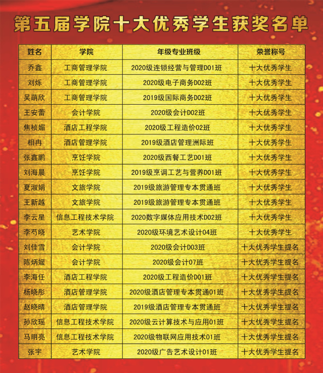 经现场评选,2019级旅游管理专本贯通班夏淑娟等同学荣获学院“十大优秀学生”称号,2020级会计D03班刘佳雪等同学荣获“十大优秀学生”提名奖。