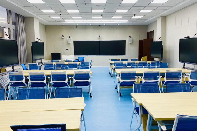 智慧教室演示设备包含2块教师86寸显示屏、6块学生小组互动演示65寸显示屏,具有小组研讨录制功能。智慧教室软件系统集成微信验证、课程班级设置、智慧教学、课堂互动、大数据课堂分析、学生随机点名与考勤等功能,并为学生提供学习系统,实现实时交流交互。