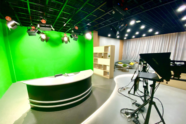 融媒体录制中心和智慧教室位于图书馆五楼。融媒体录制中心分为虚拟抠像区域、实景拍摄区域。其中,实景区域具有演讲比赛、汇报、节目录制等功能;虚拟抠像区域具有自由更换场地背景、自由组合录制画面等功能。录制系统均以广播级摄像机录制技术为基础,结合虚拟技术的辅助,可通过全景照片、PPT简报、网络资源、摄像机或者真实取景,使教师置身充满未来感的场景中,并可以进行网络同步直播,真正打通授课零距离。